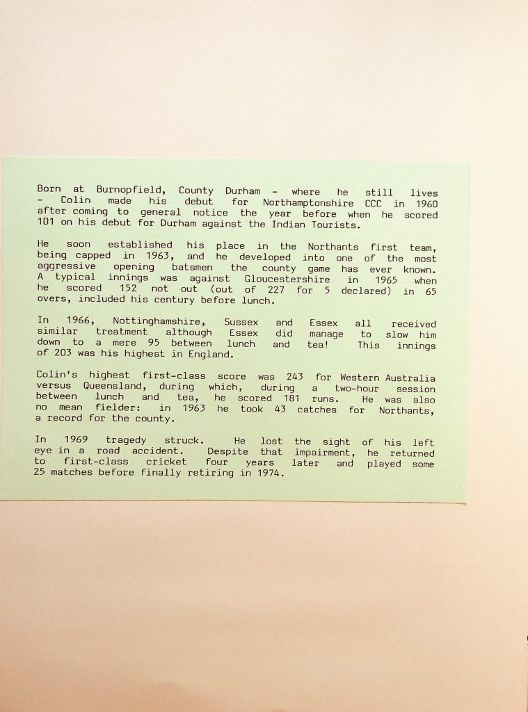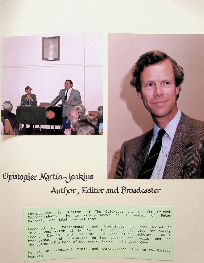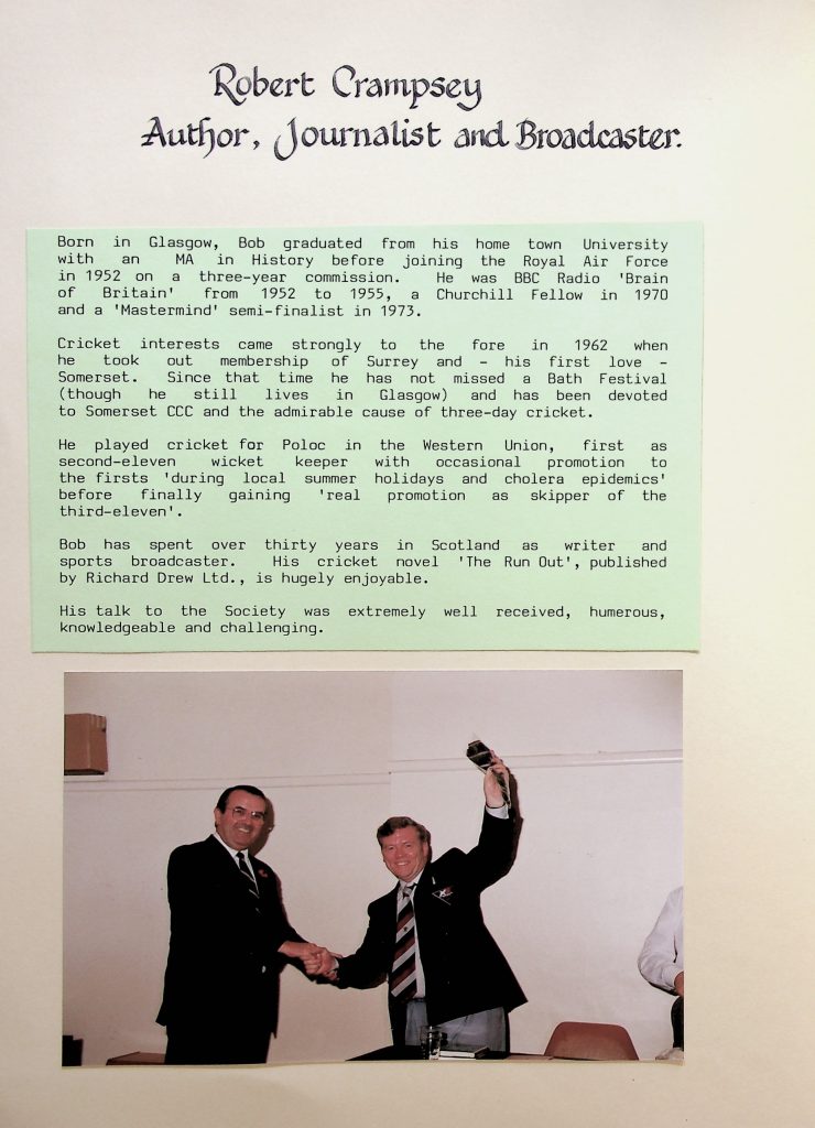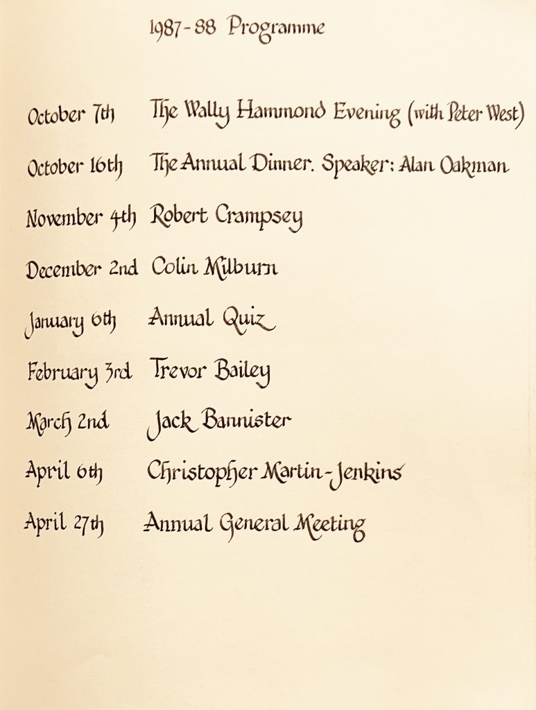 Programme for 1987/1988The Wally Hammond evening with Peter West and Tom Graveney) 07 Oct 1987 The Wally Hammond evening with Peter West and Tom Graveney) 07 Oct 1987 The CCS Annual Dinner with guest speaker Alan Oakman – 16 Oct 1987 (L-R) Alan Oakman, George Beckley, Peter West, Nigel Cooke The CCS Annual Dinner with guest speaker Alan Oakman – 16 Oct 1987Robert Crampsey – 04 Dec 1987Robert Crampsey – 04 Dec 1987 (3rd from right)Colin Milburn – Pen portrait – 02 Dec 1987Colin Milburn – 02 Dec 1987Trevor Bailey, Pen portrait – 03 Feb 1988Jack Bannister – 02 Mar 1988Christopher Martin-Jenkins – 06 Apr 1988